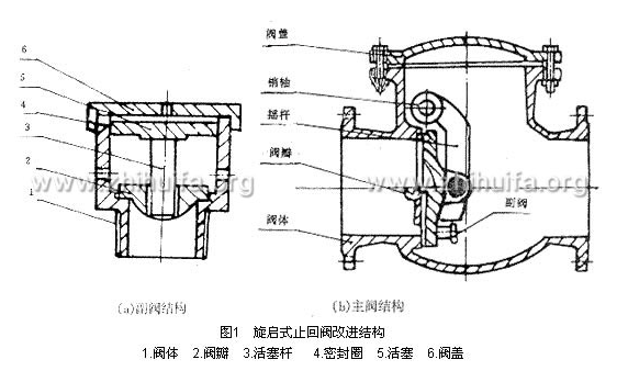 在原旋啟式止回閥閥瓣上增設(shè)緩閉副閥(圖1)。副閥安裝在主閥閥瓣下側(cè)或兩側(cè)且用螺紋聯(lián)接,介質(zhì)正常流動閥門開啟時,介質(zhì)壓力將副 閥打開,介質(zhì)通過副閥小孔流入主閥出口端,使主閥進(jìn)水口端卸壓,主閥閥瓣開啟,主閥前后壓力趨于平衡;介質(zhì)逆流時,主閥閥瓣在逆流介質(zhì)作用下快速關(guān)閉,而副閥閥體上部為緩沖缸,副閥閥蓋旋入閥體上部其蓋上有一小孔,副閥閥瓣與其活塞桿空套有一定間隙,活塞與緩沖缸之間采用O型橡膠圈密封,活塞下部與閥瓣之間為平面密封;當(dāng)副閥閥瓣隨主閥閥瓣關(guān)閉而關(guān)閉時,因副閥閥蓋小孔的作用,介質(zhì)通過小孔逐漸流入副閥緩沖缸上腔體,一部分介質(zhì)通過副閥閥瓣與活塞桿之間的間隙倒流,故副閥活塞是緩慢關(guān)閉的。該結(jié)構(gòu)主閥的關(guān)閉相當(dāng)于快關(guān)階段,副閥的 緩慢關(guān)閉相當(dāng)于慢關(guān)階段,依據(jù)泵站機(jī)組水力和機(jī)械過渡機(jī)理說明該結(jié)構(gòu)設(shè)計(jì)能有 效地防止水錘升壓。