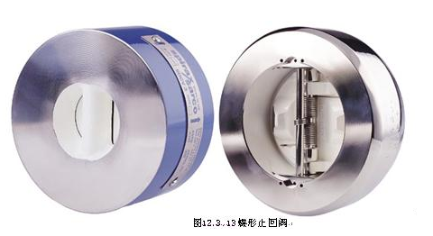 蝶形止回閥或雙盤式止回閥克服了擺動式及碟片式止回閥的口徑和壓降限制,懸啟式止回閥的閥瓣被 一分為二,在中間鉸接。這樣兩個碟片只能在一個方向擺動,碟片靠裝在鉸鏈上的紐彈簧壓在閥座上。 為了能在流道中心有一個鉸鏈,需在外面安裝一個固定銷,這樣就會引起閥門的泄漏,設(shè)計改進后 可在里面安裝,流體就可以密封在閥體內(nèi)部,不會泄漏到外面(見圖12.3.13)。