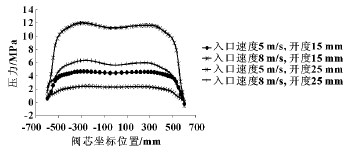 對閥內(nèi)流場進(jìn)行數(shù)值模擬,可以給出閥芯在不同位置時(shí),沿閥芯表面的壓力分布,以此可研究調(diào)節(jié)閥在不同位置時(shí)受到的不平衡力。圖4為不同開度、不同流量時(shí)閥芯底部壓力分布??梢钥闯觯洪y通過相同流量時(shí),開口度越大,不平衡力越小;開口度不變時(shí),隨著流量的增加閥芯底部壓力急劇增加,小開口度時(shí)尤甚,由于節(jié)流口的作用,靠近節(jié)流口部位的壓力變化最明顯,閥中心位置壓力變化稍緩。