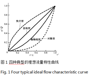 在常見的調(diào)節(jié)閥中,有四種典型的流量特性曲線,即直線型、對數(shù)型(也稱等百分比型)、快開型、拋物線型」,分別對應(yīng)圖1中的曲線1、2、3、4。直線型流量特性的調(diào)節(jié)閥,流量隨行程線性變化,在小開度時流量變化明顯(流量變化量與流量的比值大),調(diào)節(jié)靈敏度高,而在大開度時,流量變化相對緩慢(流量變化量與流量的比值?。?,調(diào)節(jié)靈敏度低,因而出現(xiàn)大開度下調(diào)節(jié)能力不足等問題,因此在一些情況下不能滿足調(diào)節(jié)要求。對數(shù)型流量特性的調(diào)節(jié)閥,流量變化速度逐漸加快,小開度時流量變化緩慢,調(diào)節(jié)精度高,大開度時流量變化相對較快,能保持良好的調(diào)節(jié)能力,這些特點使其在工程中得到了廣泛的應(yīng)用。拋物線型調(diào)節(jié)閥的調(diào)節(jié)特性介于直線型和對數(shù)型兩者之間田,這種特性的調(diào)節(jié)閥在工程應(yīng)用中也比較常見??扉_型調(diào)節(jié)閥的調(diào)節(jié)特點與對數(shù)型相反,小開度時流量迅速變化,達(dá)到快速加大流量的目的,而大開度時流量變化緩慢。除了這四種典型曲線外,還有雙曲線型、平方根型等流量特性曲線,但并不常見。
