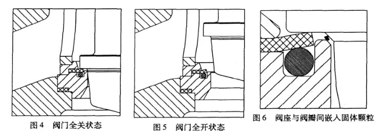 對(duì)于夾帶固體顆粒的流體介質(zhì) ,軟閥座閥門(mén)的密封結(jié)構(gòu)更為重要。這主要是因?yàn)榻橘|(zhì)中夾帶有固體顆粒時(shí) ,極容易卡在閥瓣和閥座的密封面之間 ,妨礙了閥座的密封 ,會(huì)引起泄漏 ,繼而由于介質(zhì)的高速?zèng)_刷而使閥座表面被沖蝕破壞。對(duì)于上述具有二級(jí)關(guān)閉作用的軟閥座密封結(jié)構(gòu) (圖 6) ,即使出現(xiàn)了這種顆粒卡在閥瓣和閥座金屬密封部位之間 ,也不會(huì)有什么危害 ,因?yàn)檫€有閥瓣和軟閥座之間的密封 ,仍能起到可靠有效的補(bǔ)充密封作用。