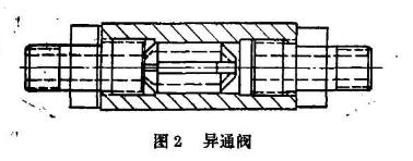 在氣缸下部進(jìn)出口處安裝一只降噪異通閥,此閥進(jìn)氣時(shí)由于阻尼作用,能夠控制啟動(dòng)氣流量,排氣時(shí)則自動(dòng)轉(zhuǎn)換成正常通路。同時(shí),活塞下部氣缸間的空間容積盡可能變 小。在這二個(gè)條件同時(shí)具備情況下,當(dāng)楔式閘板受活塞和閥桿推力開(kāi)動(dòng)》活塞快速移動(dòng)一小距離時(shí),其下部空間壓力隨即變小,甚至產(chǎn)生瞬時(shí)負(fù)壓。從而可減小或避免氣流沖九達(dá)到降噪目的。見(jiàn)圖1。為了降低開(kāi)閥噪聲我所自制了一只降噪異通閥(見(jiàn)圖2),用于氣動(dòng)閘閥壽命試驗(yàn)氣路上,試驗(yàn)中對(duì)閥門(mén)啟動(dòng)有較好的減噪作用。由于當(dāng)時(shí)受試驗(yàn)用閥門(mén)的氣動(dòng)構(gòu)件設(shè)計(jì)制造情況所限,其實(shí)際空間容積 VG較大,上述二個(gè)條件中小的條件不滿足,因而降噪程度還未能達(dá)到要求。筆者認(rèn)為,如果進(jìn)一步降低VG,則降噪效果將會(huì)提高。