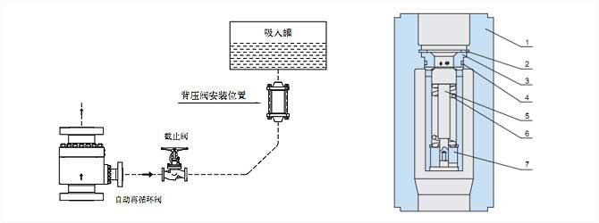 泵保護閥是自力式的,受到彈簧力作用的閥芯沿軸向運動,這樣在背壓閥前后產(chǎn)生壓差。同時,閥座上孔的開度逐漸變大,直至壓差到達設定點。