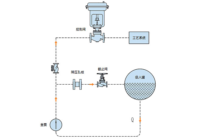 連續(xù)循環(huán)系統(tǒng)泵的最小需求流量與系統(tǒng)的工藝流量變化無關(guān)。最小流量設(shè)定好后經(jīng)過減壓孔板直接回流至儲罐,連續(xù)的最小流量循環(huán)雖然可以很好的保護泵,但是必須泵提供更大輸出功率以保證系統(tǒng)工藝流量加上再循環(huán)流量,造成額外的能源浪費。