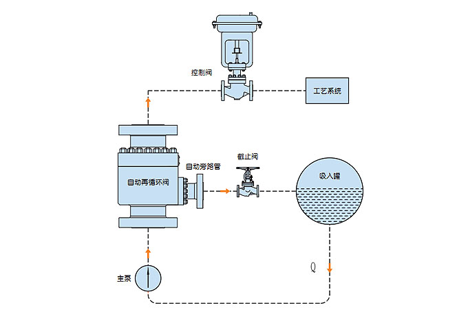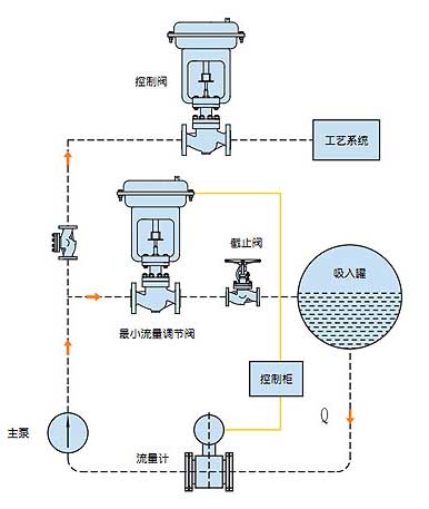 現(xiàn)代工業(yè)設(shè)備工藝過程中,要求離心泵基本上都是在變流量的狀態(tài)下工作,這就需要在工藝過程中有設(shè)置自動控制設(shè)備。然而咋離心泵在低于負荷運行時會出現(xiàn)過熱、嚴重噪聲、不穩(wěn)定和氣蝕而引起泵的損壞。這是需要一種自動再循環(huán)設(shè)備,在泵低于負荷運行時,通過旁路實現(xiàn)泵最小流量回流循環(huán)。